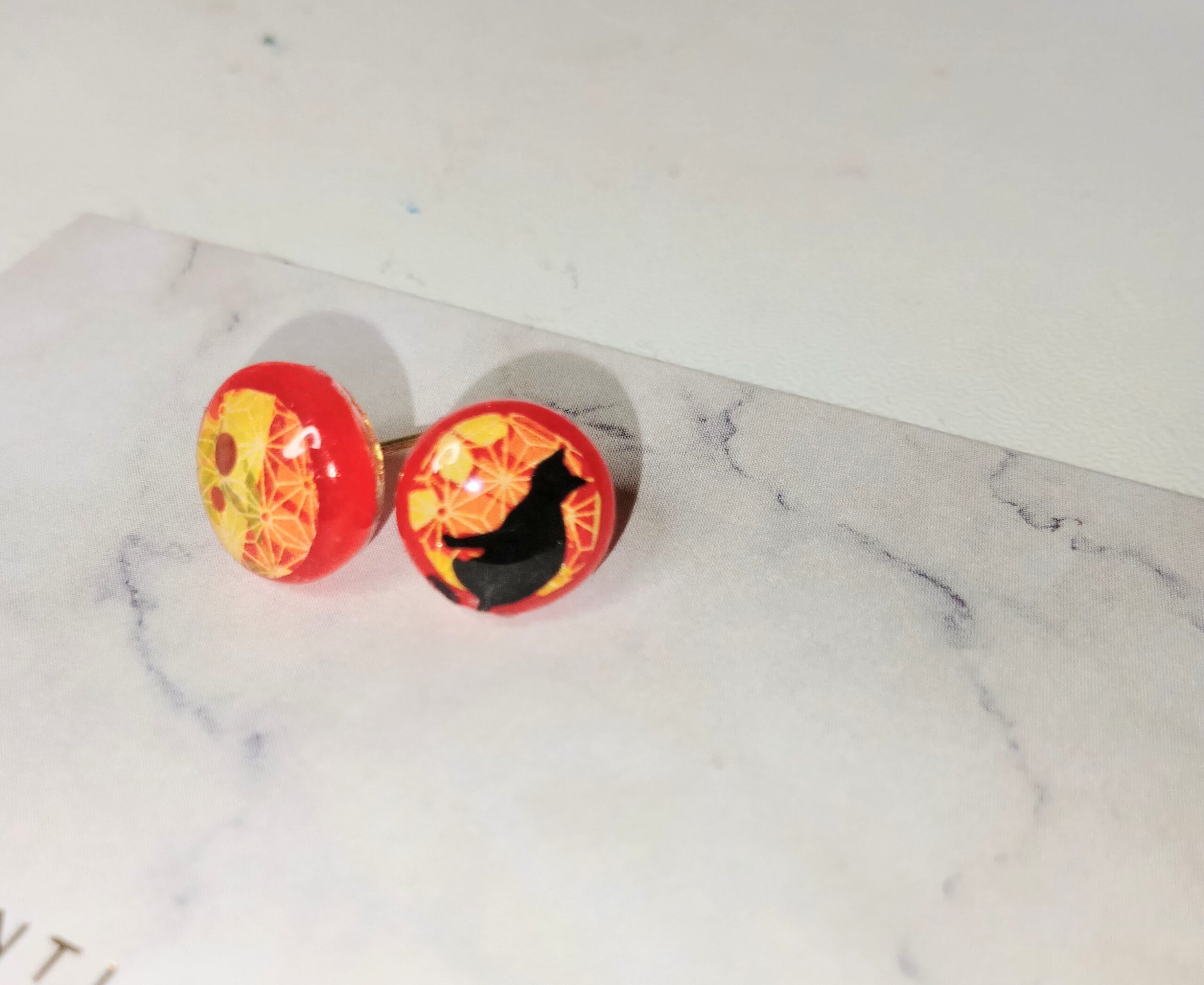 和柄に黒猫を添えて お正月や成人式などにいかがでしょうか 普段に和柄をちょっと取り入れるのもいいかもしれませんね イヤリングとピアスをお選びいただけます。